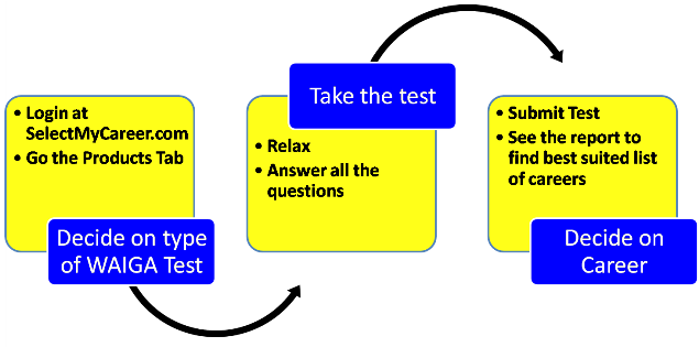 All WAIGA tests are available online at SelectMyCareer.com. Tests are available 24x7 and you can take any time in the convenience of your home, office, cyber café or anywhere in the world where you have a computer/laptop/notebook connected to internet.